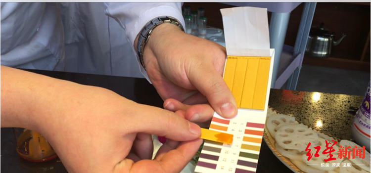 “如果呈現出來是5以下,表示是新油,如果6以上,就是老油。”3月11日,成都一家火鍋串串店用pH試紙