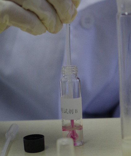 蓋緊蓋子,充分震蕩混勻1 min,靜置2~3 min,使上層液澄清。用0.5mL吸管吸取試劑A瓶中上層溶液約一半的量至試劑B瓶中;